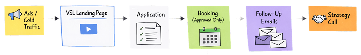 We build the full funnel (VSL, landing page, qualification application form, booking page, confirmation and thank-you pages) optimized for conversion. We also build the qualification criteria and logic that filters cold traffic into only the leads worth your team's time